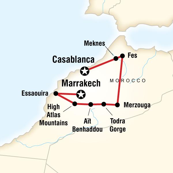 Guided walk in Meknes, Guided tour of Volubilis, Guided walk in Fez, Overnight Berber tented camp and camel excursion in desert, Walk though local village farmland near Todra, Entrance to Aït Benhaddou kasbah, Hike in the Atlas Mountains, Orientation walk in Essaouira, Guided walk in Marrakech.
