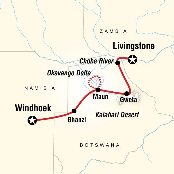 Feel the splash of the Okavango Delta from a dug-out mokoro canoe and the mists of majestic Victoria Falls—described by the local Kololo people as 'the smoke that thunders'. Experience the colours, culture and scenery of Namibia, Botswana and Zambia on this well-packed 9-day adventure. Meet the San Bushmen of the Kalahari Desert and the elephants of Chobe National Park. With a knowledgeable CEO leading the way, travel aboard our overland truck is well-paced and wilderness camping will keep you in the thick of the action. Prepare yourself for an utterly unique African experience.