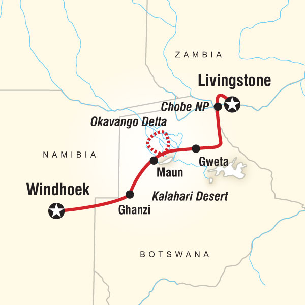 Feel the splash of the Okavango Delta from a dugout mokoro canoe and the mists of majestic Victoria Falls—described by the local Kololo people as "the smoke that thunders". Experience the colours, culture and scenery of Zambia, Botswana and Nambia on this well-packed ten-day adventure. Meet the San Bushmen of the Kalahari Desert and the elephants of Chobe National Park. With a knowledgeable CEO leading the way, travel aboard our overland truck is well paced and wilderness camping will keep you in the thick of the action. Prepare yourself for an utterly unique African experience.