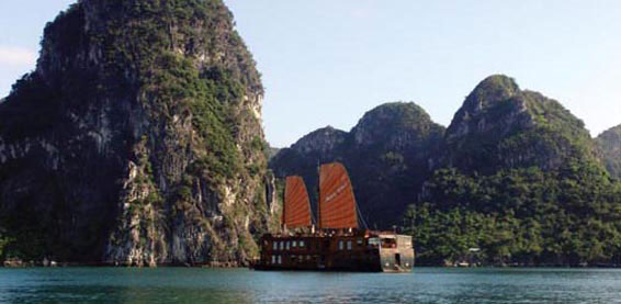 Drive to Halong Bay for your overnight cruise on a luxury junk boat • Savour a welcome drink and lunch on board • Marvel at the thousands of limestone islands that dot these waters • Transfer to a sampan and visit a floating fishing village • Watch the sunset before sharing a seafood feast.